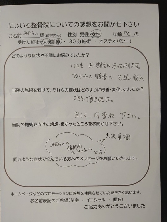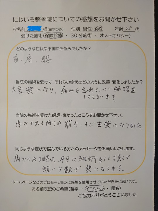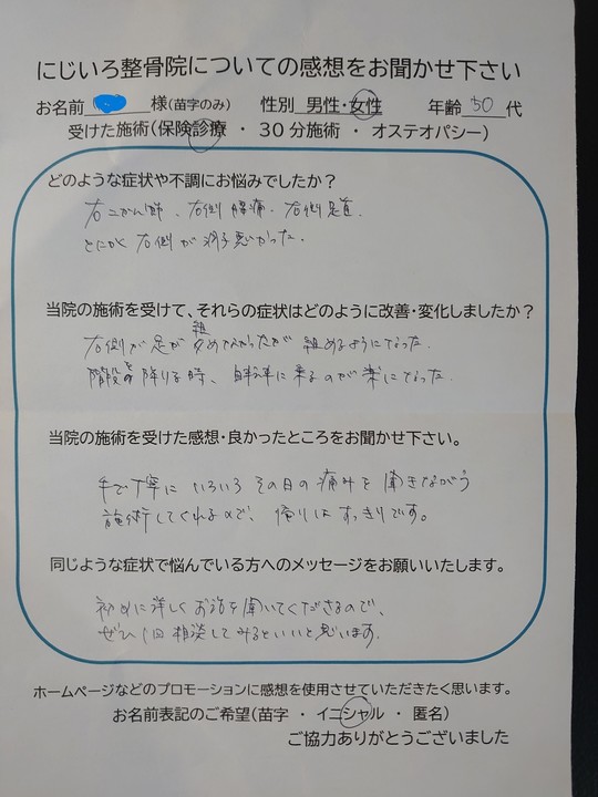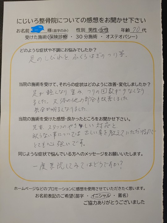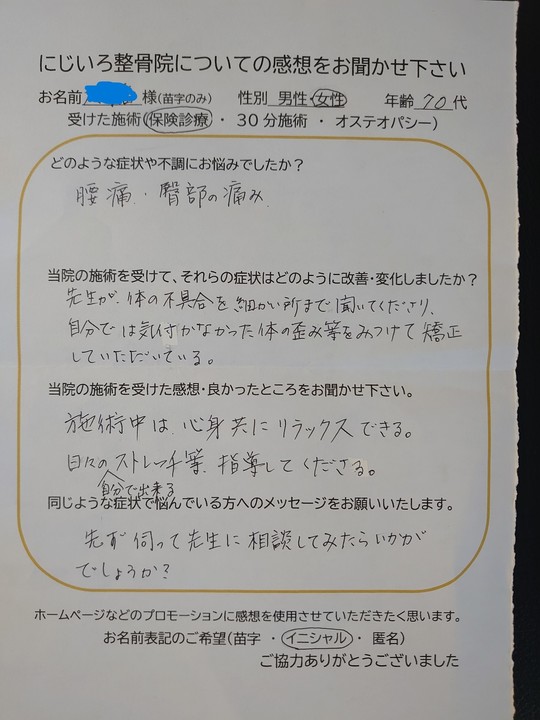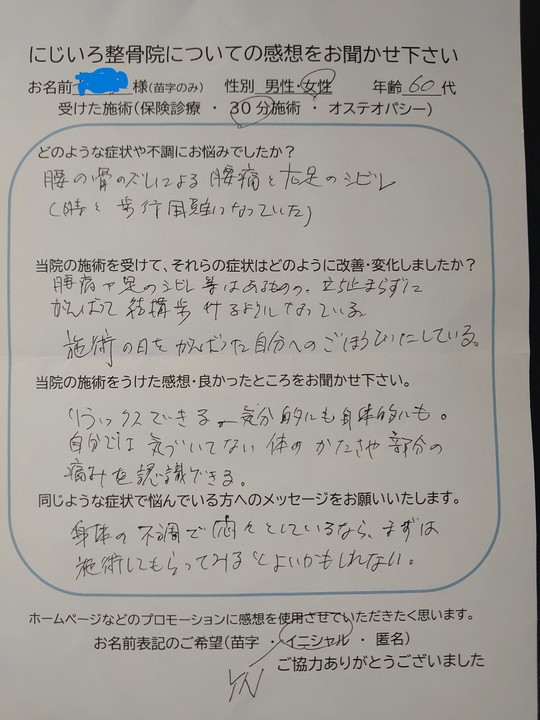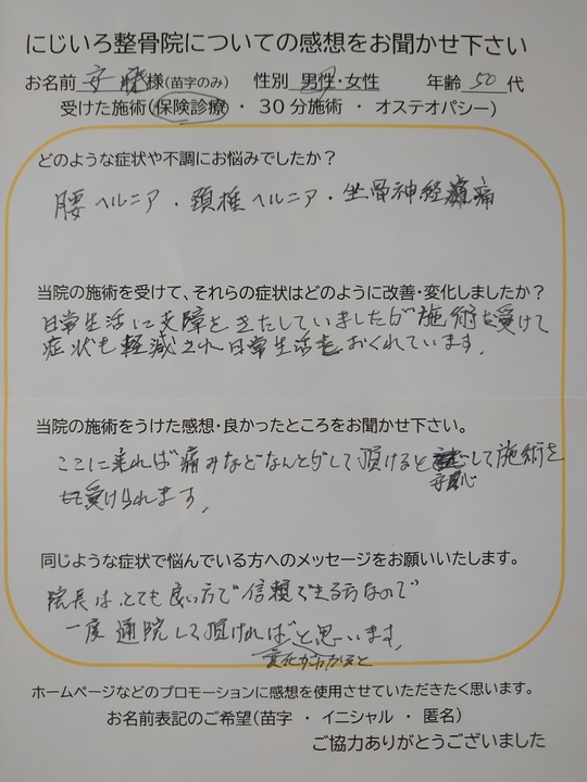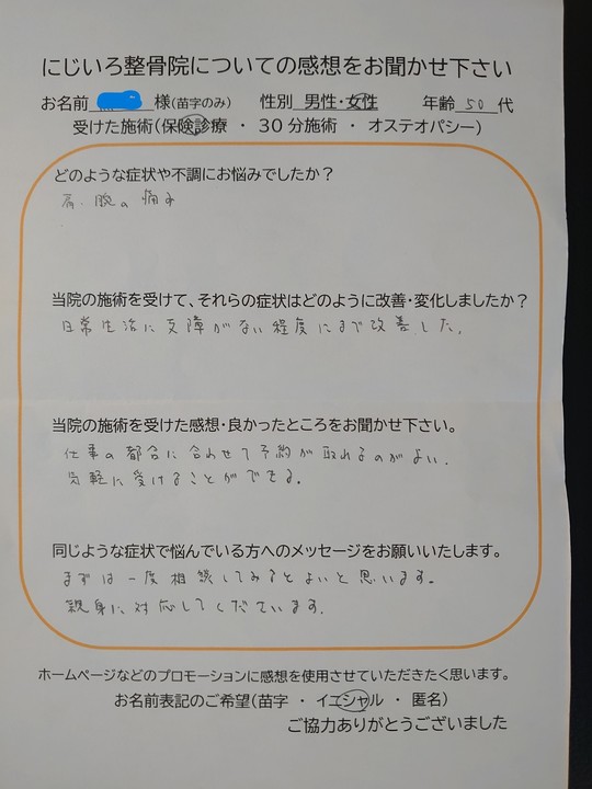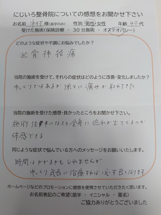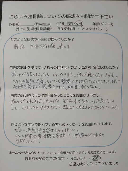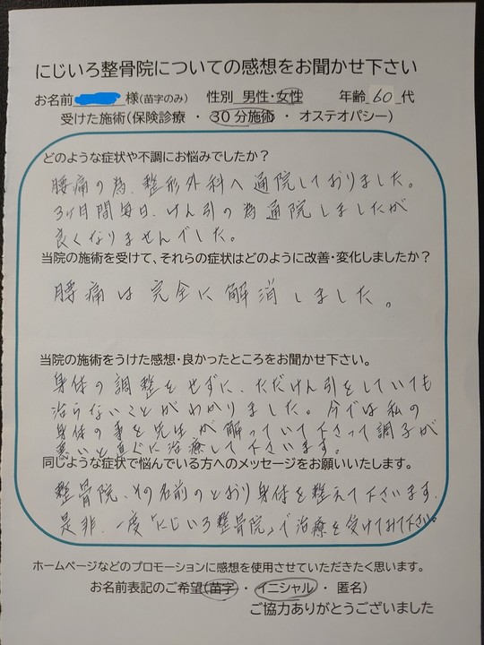 にじいろ整骨院の感想を書いて頂いた皆様、ありがとうございます。