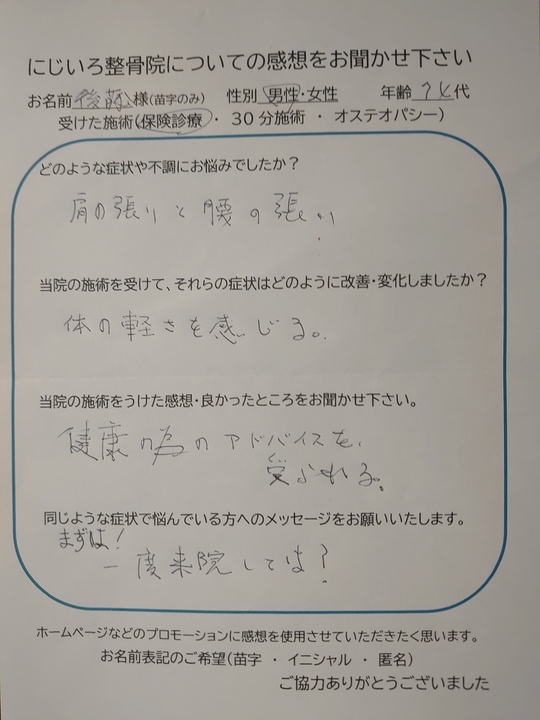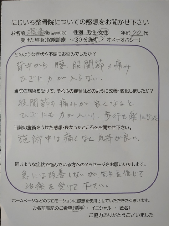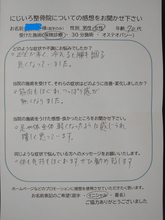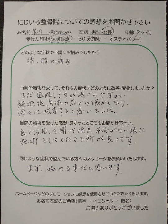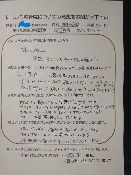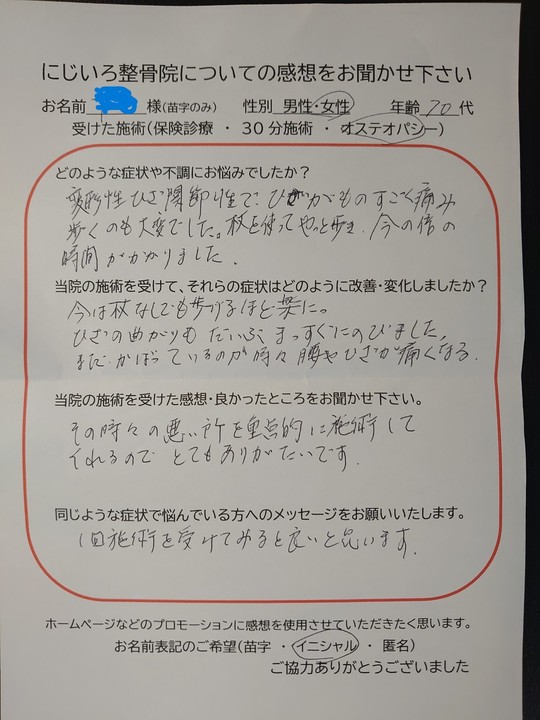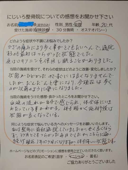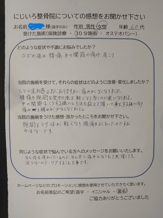 ひざの違和感はまだありますが、痛みがなくなりました。腰痛も施術を受けた後は、軽くなり、歩くのに楽になりました。手の関節は、こうする様にと方法を教えて頂いたことをする様になり痛みと腫れが少なくなりました。
