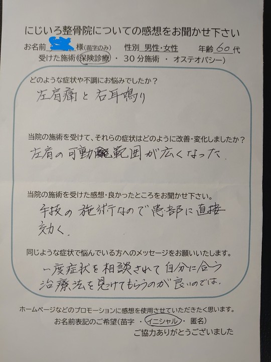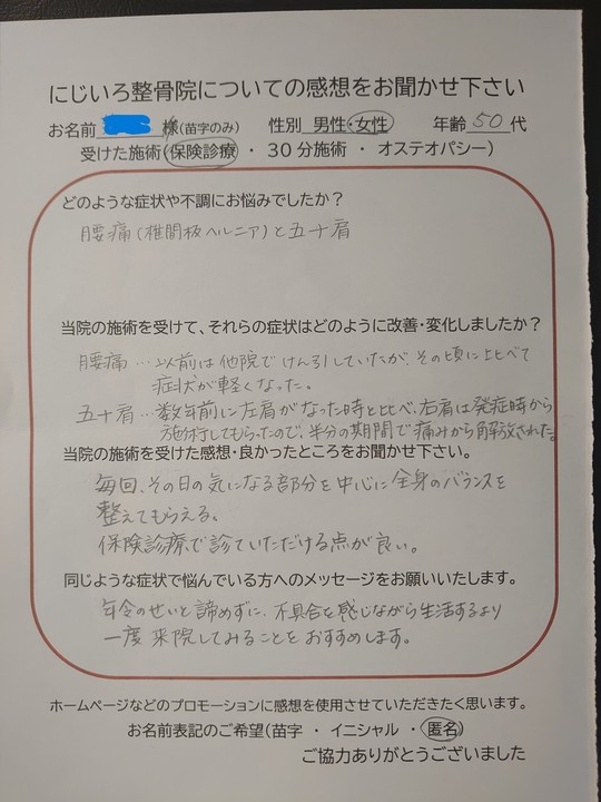 腰痛・・・以前は他院でけん引していたが、その頃とに比べて症状が軽くなった。 五十肩・・・数年前に左肩がなった時と比べ、右肩は発症時から施術してもらったので、半分の期間で痛みから解放された。