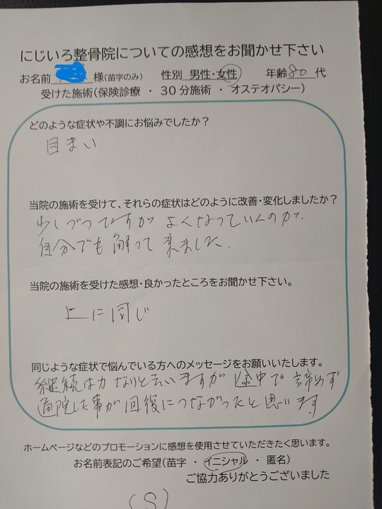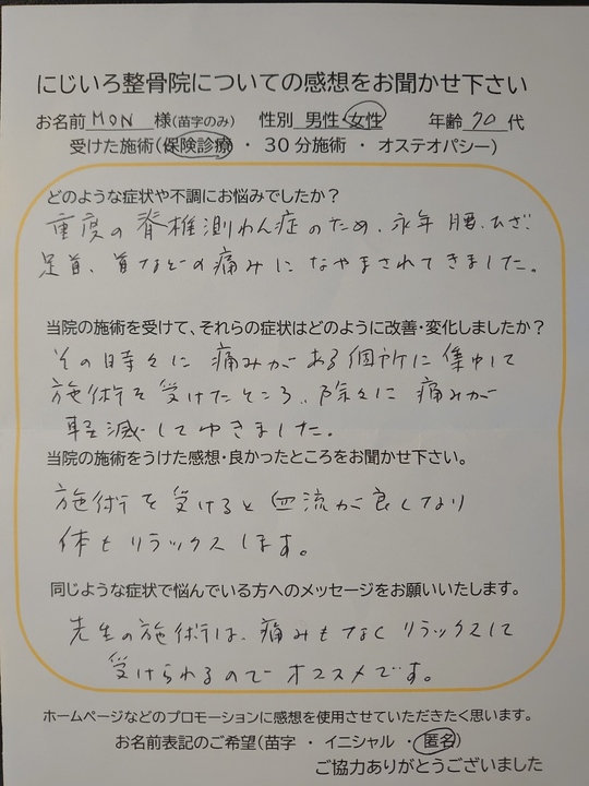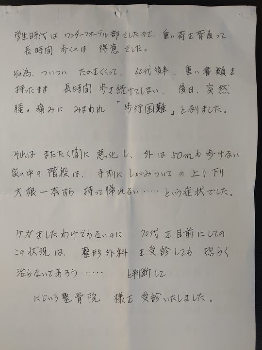 日常生活に支障をきたしていましたが施術を受けて症状も軽減され日常生活をおくれています。