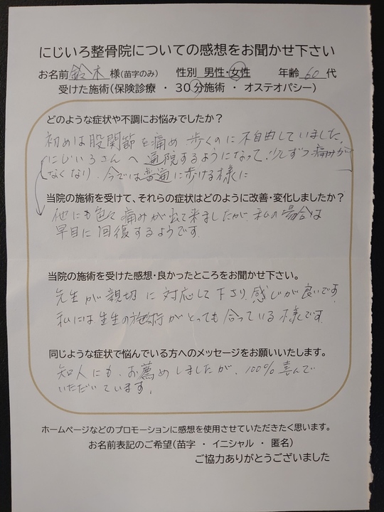 にじいろさんへ通院するようになって、少しずつ痛みがなくなり、今では普通に歩ける様に 他にもいろいろ痛みが出て来ましたが、私の場合は早目に回復するようです。