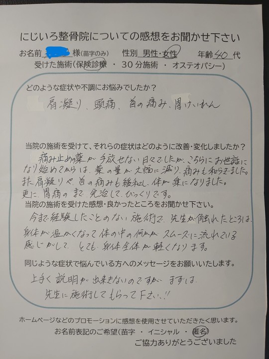 痛み止めの薬が手放せない日々でしたが、こちらにお世話になり始めてからは、薬の量が大幅に減り、痛みも和らぎました。また肩凝りや首の痛みも緩和し、体が楽になりました。更に、胃痛まで完治してびっくりです。
