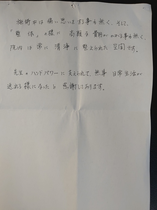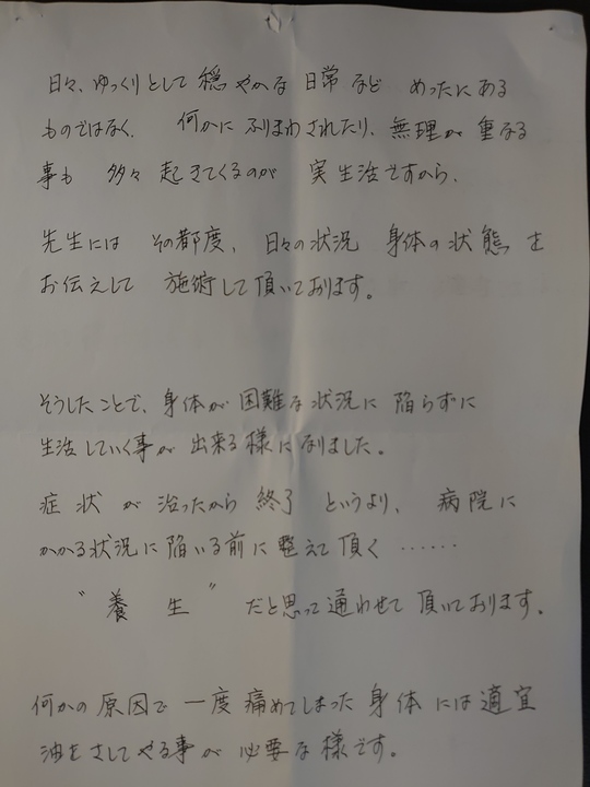 最初は膝のことで治療を受けましたが今では、その時の体調にあわせて診て頂いています。先生のお人柄に助けて頂いていることも多く、大変感謝しております。