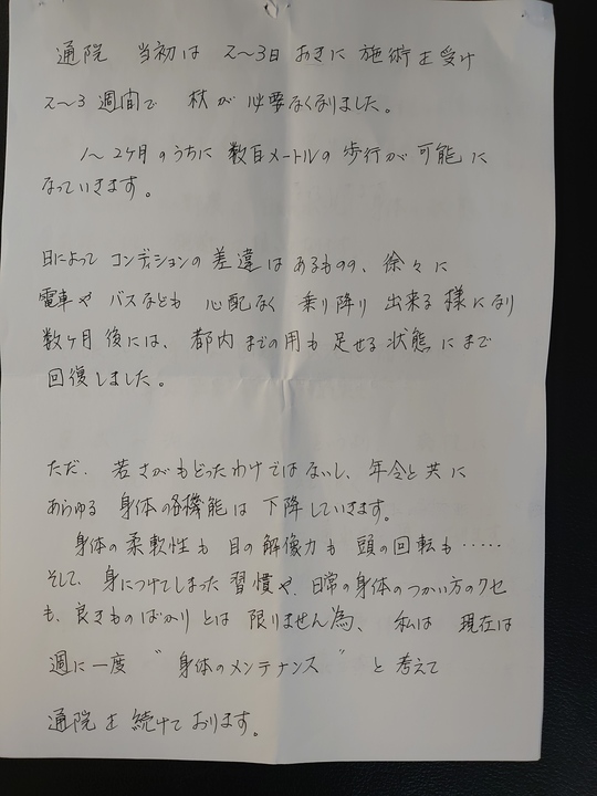 継続は力なりと言いますが途中で諦めず通院した事が回復に つながったと思います。