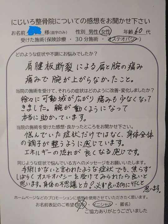 徐々に可動域が広がり痛みも少なくなってきました。腕が動くようになって本当に助かっています。